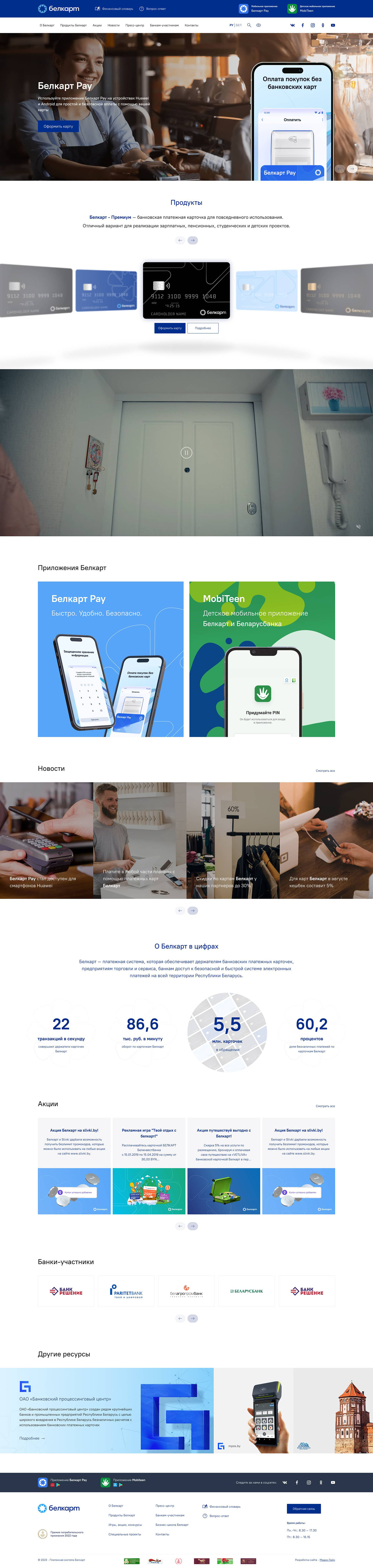 Благодаря проведенным UX-исследованиям, нам удалось выявить проблемы и ошибки в работе текущей версии сайта, разработать и применить рекомендации при разработке нового сайта. Были проведены структурные изменения для быстрого и логичного перехода к разделам и страницам. В результате мы разработали корпоративный сайт платежной системы БЕЛКАРТ, который презентует продукт, позволяет своевременно информировать пользователей о проводимых акциях, в полном объеме раскрывает преимущества продукта.